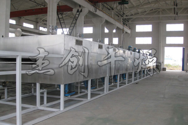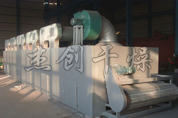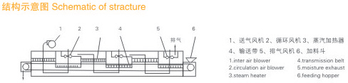 物料由加料器均勻地鋪在網(wǎng)帶上,網(wǎng)帶一般采用12-60目不銹鋼絲網(wǎng),由傳動裝置拖動在干燥機內(nèi)移動。干燥機由若干單元組成,每一單元熱風(fēng)獨立循環(huán),部分尾氣由專門排濕風(fēng)機排出,廢氣由調(diào)節(jié)閥控制,熱氣由下往上或由上往下穿過鋪滿物料的網(wǎng)帶完成熱量與質(zhì)量傳遞的進程,帶走物料水份。網(wǎng)帶緩慢移動,運行速度可根據(jù)物料溫度自由調(diào)節(jié),干燥后的成品連續(xù)落入收料器中。上下循環(huán)單元根據(jù)用戶需要可靈活配備,單元數(shù)量亦可根據(jù)需要選取。